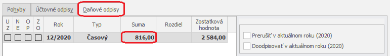 Zároveň sa automaticky do záložky Daňové odpisy zapíše daňový odpis, ktorý sa postupne kumuluje pridávaním pohybov za jednotlivé obdobia. Celkový daňový odpis za rok bude 68 x 12 = 816 eur.