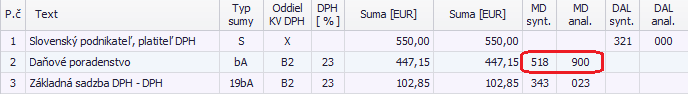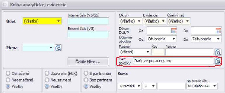V menu Prehľady – Kniha analytickej evidencie si doklady vyfiltrujeme podľa jednoznačného kritéria, napr. text položky či partner. V našom prípade je Text položky: Daňové poradenstvo.