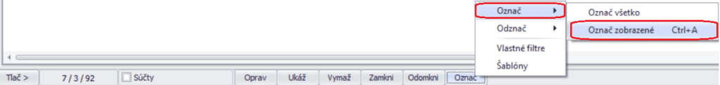 Zobrazené doklady si označíme pomocou tlačidla Označ – Označ zobrazené, ktoré sa nachádza v spodnej časti Knihy analytickej evidencie.
