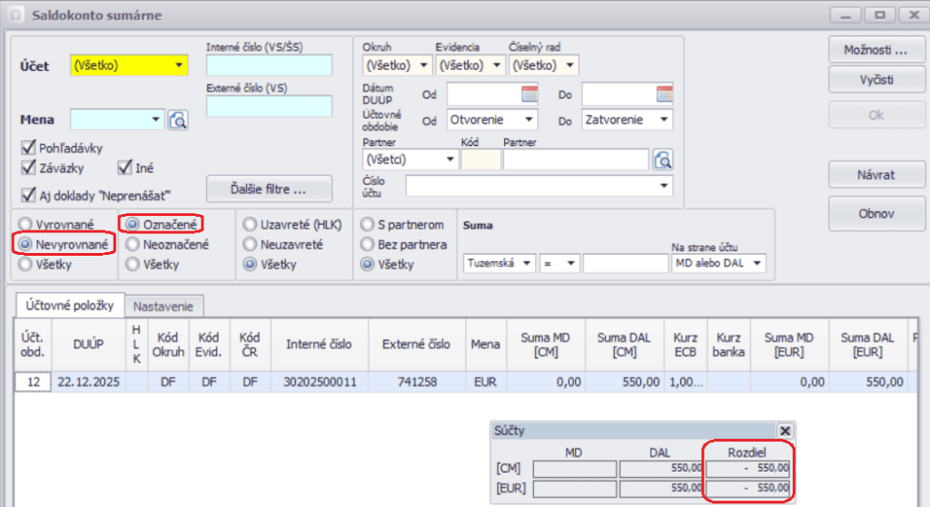 Úhrady skontrolujeme cez Prehľady – Saldokonto sumárne, kde si ako kritérium zvolíme Nevyrovnané a Označené.