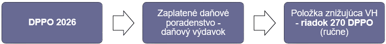 Po úhrade záväzku v roku 2026 sa daňové poradenstvo stáva daňovým výdavkom. V DPPO za rok 2026 vykonáme zníženie základu dane. Sumu 447,15 eura uvedieme ako položku znižujúcu výsledok hospodárenia do riadku 270. Vzhľadom na to, že o tom neúčtujeme, sumu v príslušnom riadku uvedieme ručne.