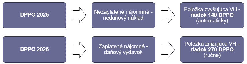 V roku 2026 bolo nájomné zaplatené a stáva sa teda daňovým výdavkom. V DPPO za rok 2026 môžeme vykonať zníženie základu dane. Sumu 364,23 eura uvedieme ako položku znižujúcu výsledok hospodárenia v riadku 270. V programe Podvojné účtovníctvo OMEGA túto hodnotu zadáme ručne do riadku 270 daňového priznania a automaticky sa vykoná zníženie základu dane.