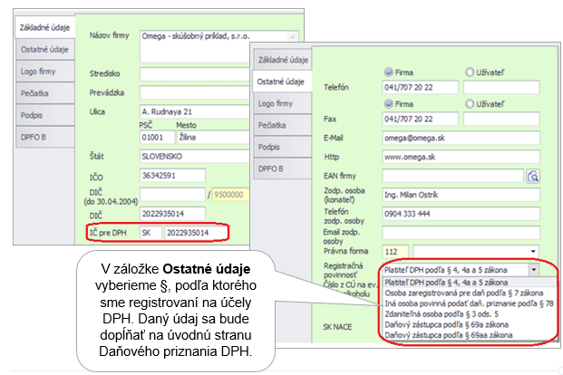 2. Pridelené IČ DPH doplníme cez menu Firma – Nastavenie – Firemné údaje priamo v záložke Základné údaje. Zároveň vyplníme bunku Registračná povinnosť v záložke Ostatné údaje.