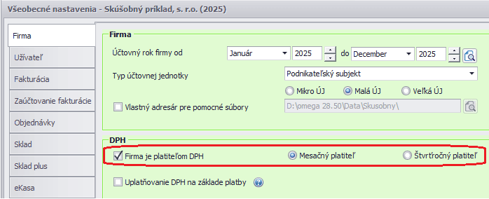 1. Cez menu Firma – Nastavenie – Všeobecné nastavenia zapneme možnosť Firma je platiteľom DPH a označíme, či sme mesačný alebo štvrťročný platiteľ DPH. Zmena sa prejaví po znovuotvorení firmy. V programe sa automaticky sprístupnia automatické účtovania a typy súm na účtovanie dokladov s DPH.