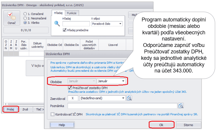 Pre vytvorenie daňového priznania k DPH alebo kontrolného výkazu DPH uzavrieme príslušné obdobie, za ktoré ich chceme podať. Uzávierku DPH vytvoríme cez menu Firma – Uzávierka – DPH pomocou tlačidla Pridaj.