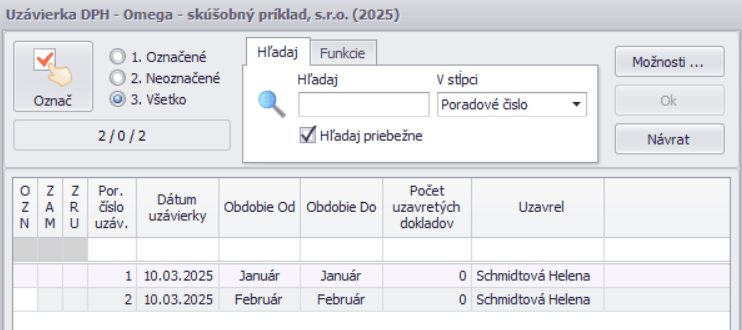 Ak sme sa stali platiteľom DPH v priebehu roka, napr. od marca, vytvoríme uzávierku aj za všetky predchádzajúce obdobia. Za tieto obdobia nepodávame daňové priznanie DPH. Počet uzavretých dokladov bude 0.