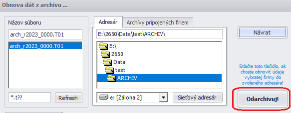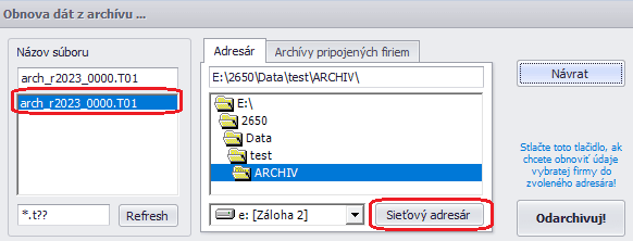 Pomocou voľby Sieťový adresár vyberieme v počítači cestu k priečinku, kde máme uložený archívny súbor. Vľavo v časti Názov súboru sa zobrazia všetky archívne súbory, ktoré sa nachádzajú vo zvolenom adresári. Vyberieme archív, ktorý chceme obnoviť (súbor s príponou .T01, napr. arch_r2023_0000.T01).