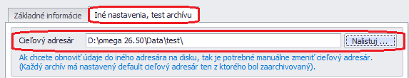 V záložke Iné nastavenia, test archívu je potrebné pomocou tlačidla Nalistuj… nastaviť správny Cieľový adresár. Ide o priečinok, do ktorého sa má databáza obnoviť.