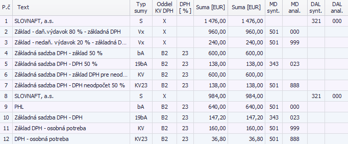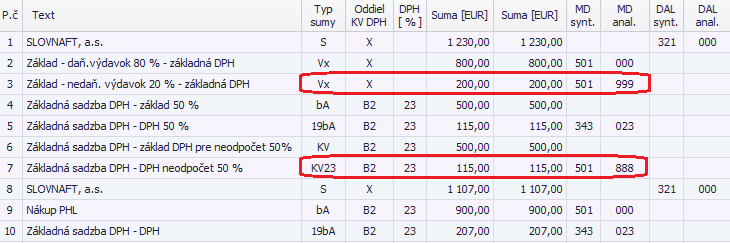 Program rozúčtuje 7 riadkový účtovný zápis. Rozpočíta samostatne základ dane pre účely ZDP v pomere 80/20 (účtujeme s typom sumy Vx) a samostatne základ dane a DPH pre účely zákona o DPH v pomere 50/50.