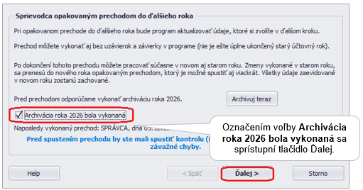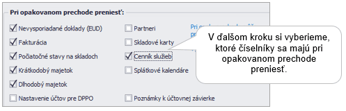 Opakovaný prechod spustíme v menu Firma – Prechod do ďalšieho roka. Pred spustením odporúčame spraviť archív databázy nového roka. V ďalšom kroku je potrebné označiť, ktoré evidencie chceme preniesť.