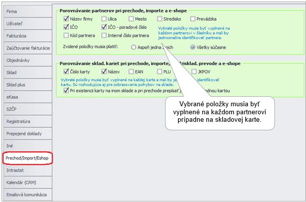 Z dôvodu, aby nevznikali duplicity, zadáme kritériá pre porovnávanie skladových kariet a partnerov. Cez menu Firma – Nastavenie – Všeobecné nastavenia v časti Prechod/Import/Eshop.