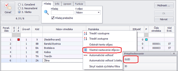 Pre zobrazenie stĺpca GUID (automaticky vygenerované číslo) napr. v číselníku stredísk, postupujeme cez menu Číselník – Strediská (zákazky, činnosti, pracovníci), klikneme pravým tlačidlom myši na názov stĺpca (napr. Názov strediska) a vyberieme možnosť Vlastné nastavenie stĺpcov. Zobrazí sa formulár Prispôsobenie a následne dvojklikom na názov GUID sa stĺpec zobrazí na konci prehľadu.