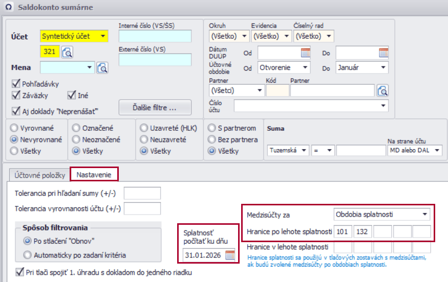 V ľavej časti formulára si zadefinujeme záväzkový účet, napr. 321 – Dodávatelia. Nastavíme si účtovné obdobie od Otvorenie. Účtovné obdobie „do“ zvolíme podľa mesiaca, za ktorý si kontrolujeme lehotu splatnosti neuhradených záväzkov. Zvolíme si možnosť Nevyrovnané, ktorá sa nachádza v ľavej časti, aby sme si odfiltrovali len doklady, ktoré nie sú uhradené.