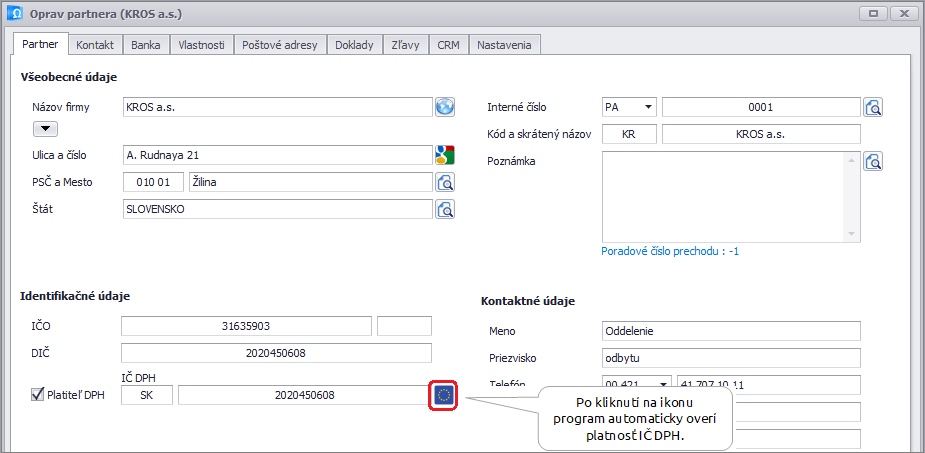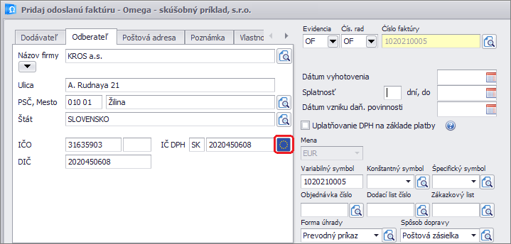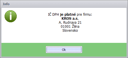- IČ DPH je platné – môžeme ďalej pracovať s vytváraním dokladu bez toho, že by sme IČ DPH museli overovať mimo program OMEGA.