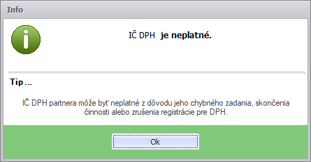 - IČ DPH je neplatné – odporúčame skontrolovať, či je IČ DPH zadané správne, prípadne či nebola zrušená registrácia pre DPH u obchodného partnera.