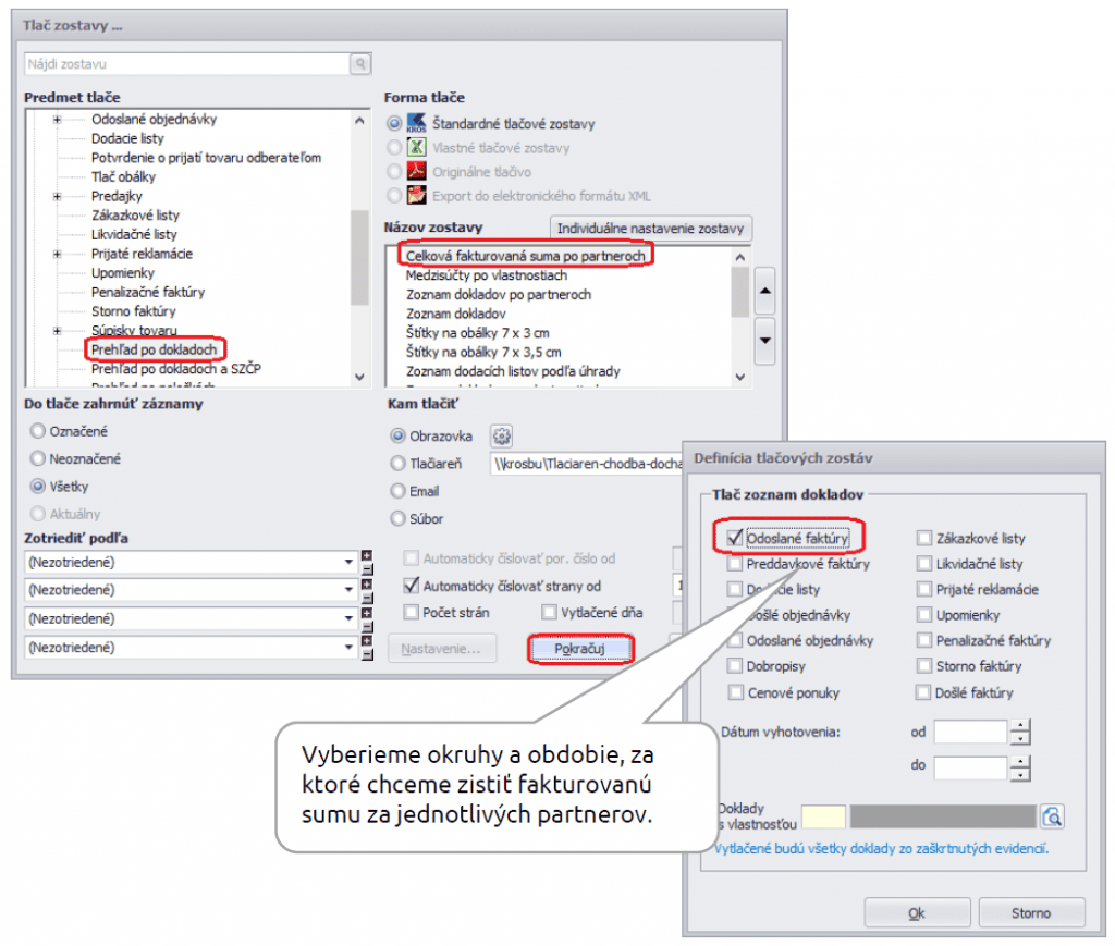 Pomocou tlačovej zostavy Celková fakturovaná suma po partneroch zistíme, kto z partnerov je náš najväčší odberateľ, prípadne naopak. Túto zostavu vytlačíme cez menu Fakturácia – Odoslané faktúry – Tlač – Prehľad po dokladoch – Celková fakturovaná suma po partneroch.