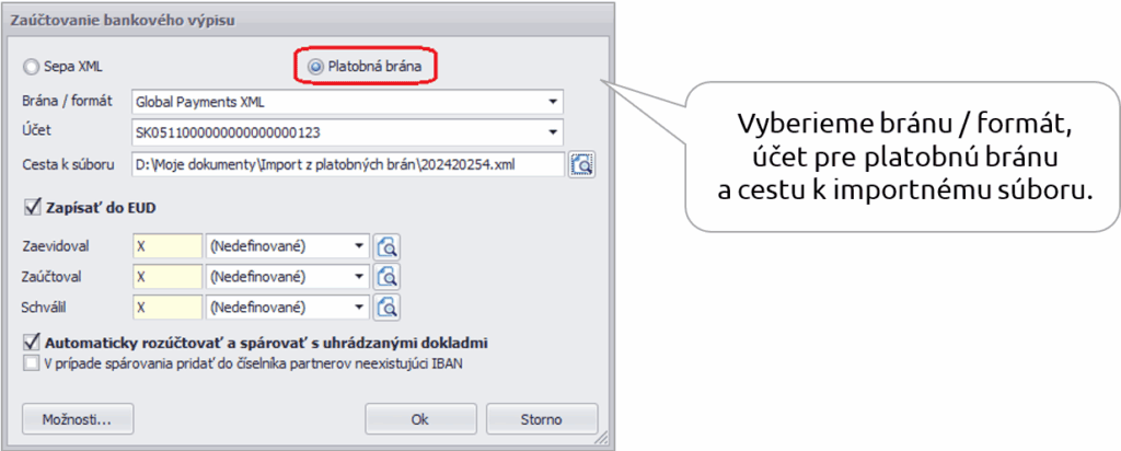 Naimportované položky výpisu z platobnej brány môžeme dať automaticky zaúčtovať do Evidencie účtovných dokladov, rozúčtovať a spárovať s uhrádzanými dokladmi. Podmienky pre zaúčtovanie výpisu sú obdobné ako pri importe bankového výpisu vo formáte SEPA xml.
