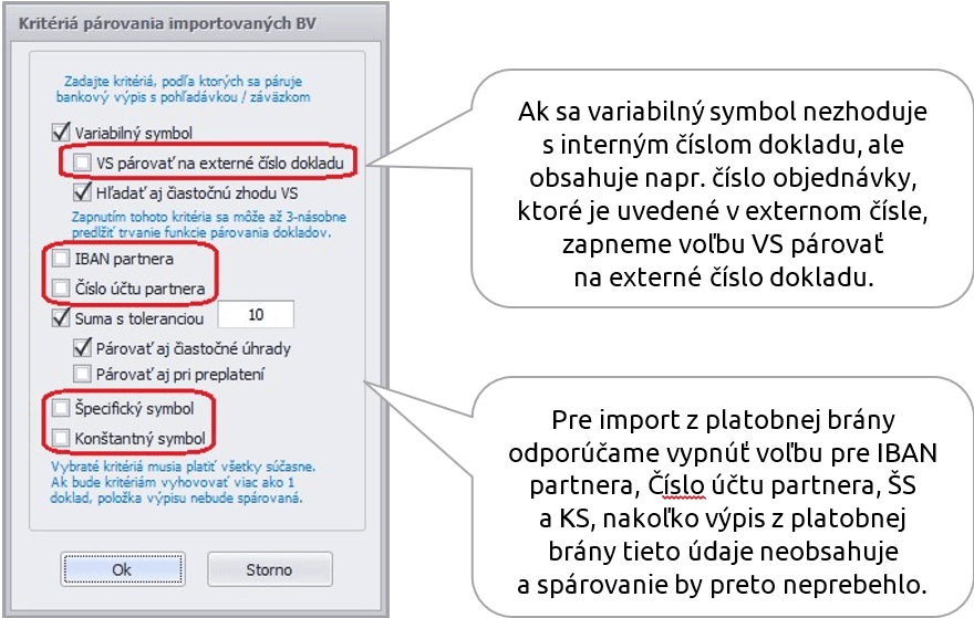 Podľa kritérií párovania, ako je napr. variabilný symbol, sa spárujú a uhradia odoslané faktúry, odoslané dobropisy a podobne. Pre ostatné pohyby, ako napr. poplatky, je potrebné zadefinovať pravidlo pre zaúčtovanie. Kritériá párovania i pravidlá pre zaúčtovanie si sprístupníme cez Možnosti vo formulári pre Zaúčtovanie bankového výpisu.