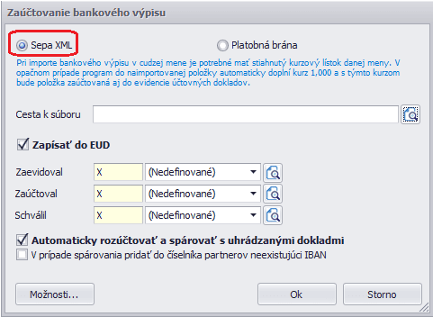 Niektoré platobné brány (napr. PayOut) je možné importovať aj vo formáte Sepa XML v prípade, ak platobná brána umožňuje export do formátu SepaXML campt.053. Takýto import vykonáme cez menu Evidencia – Importované bankové výpisy – Funkcie – Načítaj výpis. Je potrebné vybrať voľbu Sepa XML.