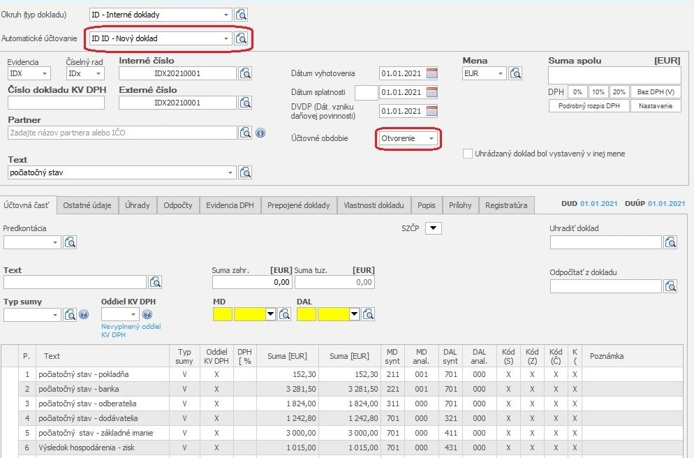 - V Evidencii účtovných dokladov zvolíme okruh ID a tlačidlom Pridaj si otvoríme nový formulár. Pomocou automatického účtovania ID – Nový doklad zaevidujeme zostatok jednotlivých súvahových účtov voči účtu 701. Doklad uložíme do účtovného obdobia Otvorenie.