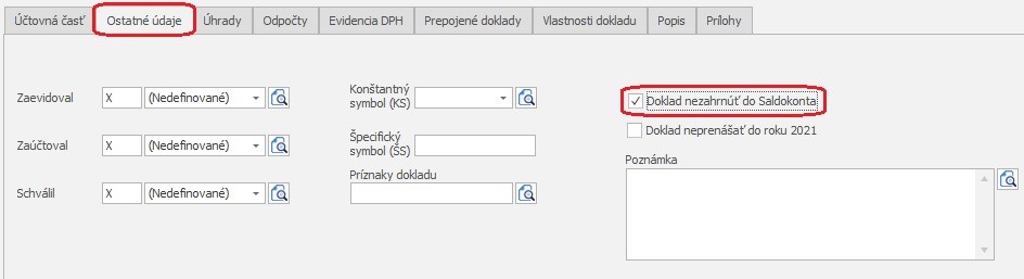 - v záložke Ostatné údaje zapneme voľbu Doklad nezahrnúť do Saldokonta. Zapnutím voľby sa údaje načítajú do bezprostredne predchádzajúceho obdobia do Súvahy. Zároveň táto voľba zabezpečí, že doklad nevstúpi do saldokonta.