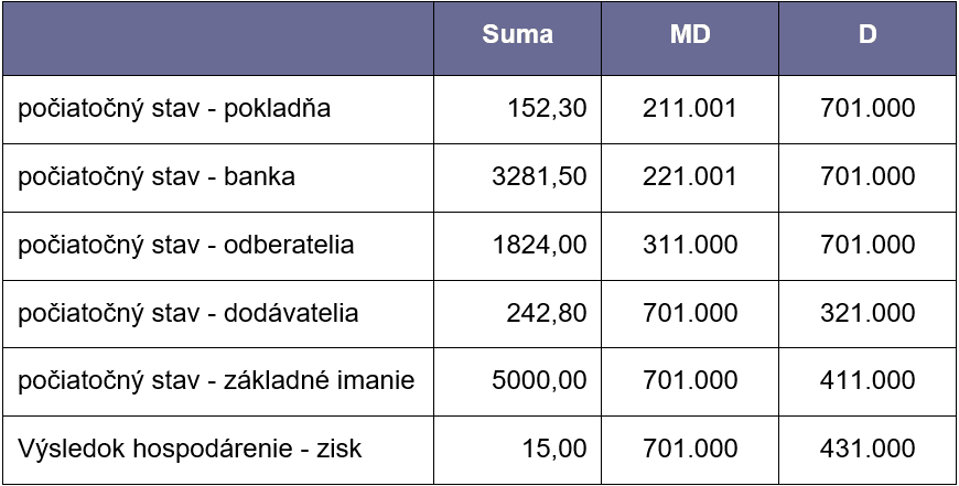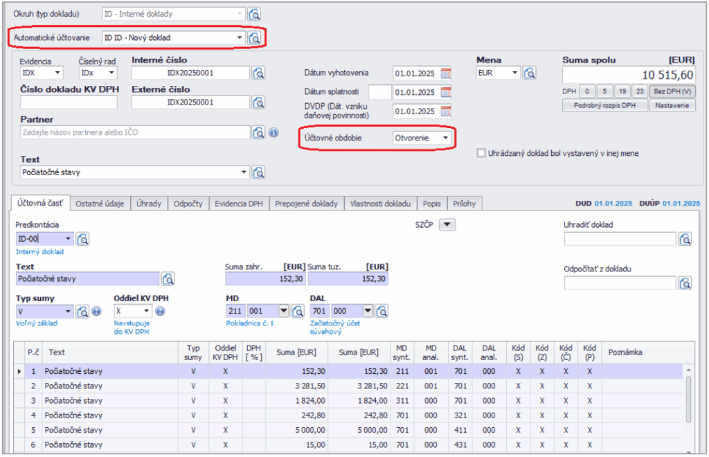 V prípade, že prechádzame na program od začiatku kalendárneho/hospodárskeho obdobia, počiatočné stavy jednotlivých súvahových účtov môžeme zaevidovať voči účtu 701 pomocou Interného dokladu v období Otvorenie.