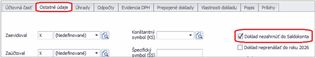 - V záložke Ostatné údaje zapneme voľbu Doklad nezahrnúť do Saldokonta. Zapnutím voľby sa údaje načítajú do bezprostredne predchádzajúceho obdobia do Súvahy. Zároveň táto voľba zabezpečí, že doklad nevstúpi do saldokonta.
