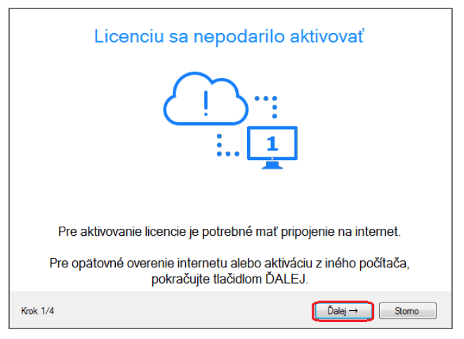 - Spustí sa ,,Sprievodca aktiváciou licencie“. Pre overenie internetu zvolíme tlačidlo ,,Ďalej“.