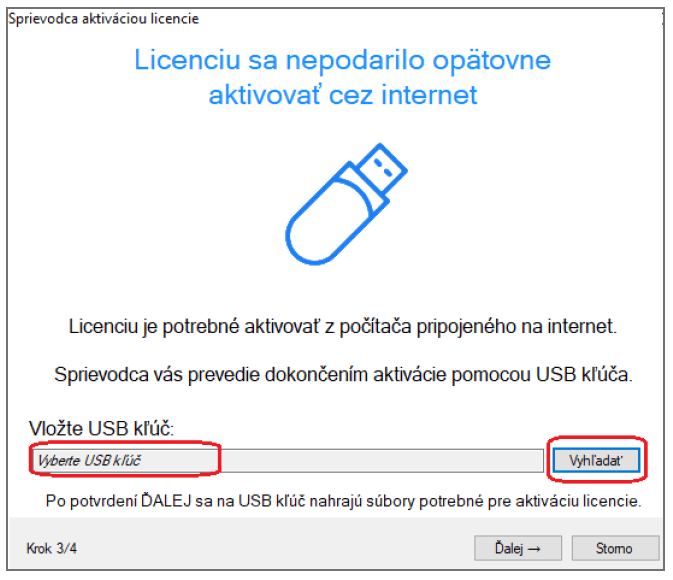 - Vložíme USB kľúč do počítača a pomocou tlačidla ,,Vyhľadať“ zvolíme cestu k USB kľúču. Po potvrdení tlačidla ,,Ďalej“ sa na USB kľúč nahrajú súbory potrebné pre aktiváciu licencie.