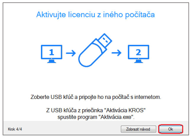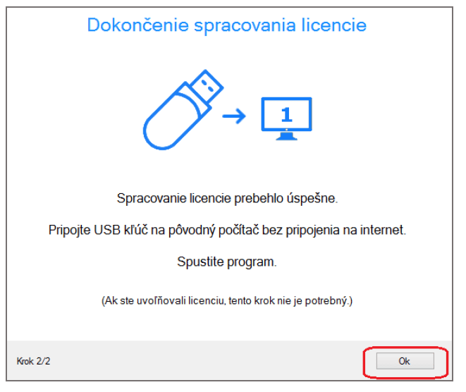 Pomocou sprievodcu aktivácie licencie sme v predchádzajúcich krokoch na USB kľúč nahrali údaje, ktoré sú potrebné pre aktiváciu. Ďalej budeme postupovať nasledovne: