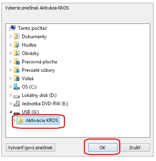 - Vyhľadáme USB kľúč, na ktorom vyberieme priečinok Aktivácia KROS a potvrdíme tlačidlom OK.