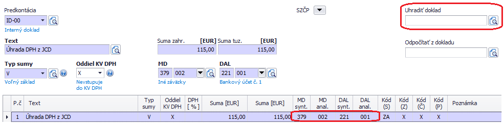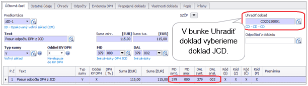 DPH z colného dokladu sa zobrazí v DP DPH až v zdaňovacom období, kedy sa doklad uhradí, v našom príklade v mesiaci august. Nakoľko odpočet DPH chceme posunúť až na september, zaevidujeme samostatný doklad s úhradou JCD a samostatný doklad na uplatnenie posunutého odpočtu DPH.