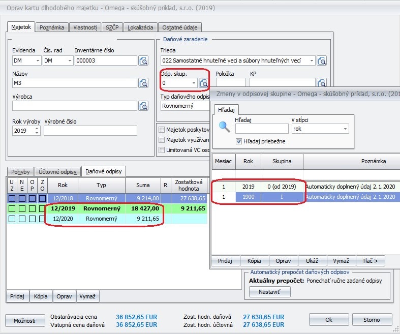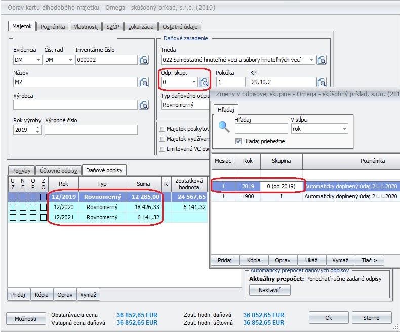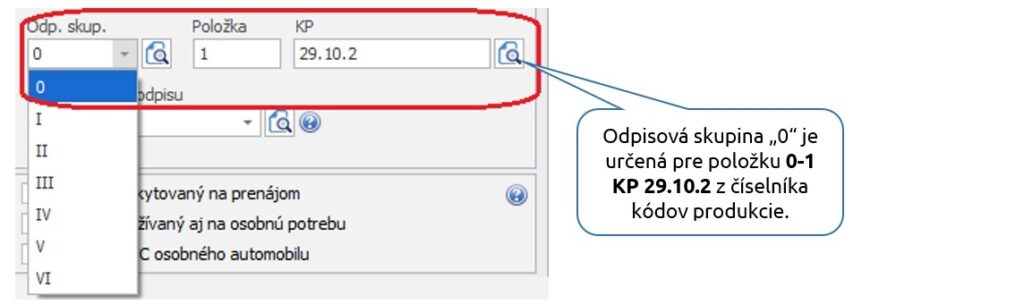 V OMEGE je odpisová skupina „0“ v ponuke vo verzii 23.00 a vyššej. Zmenu odpisovej skupiny je potrebné na príslušných kartách urobiť ručne.