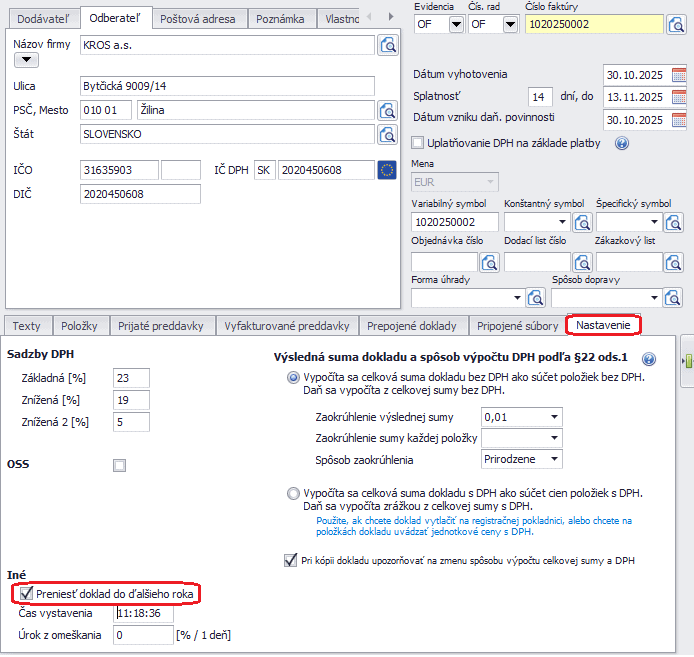 Na doklade, ktorý chceme preniesť do databázy 2026, si zapneme voľbu Preniesť doklad do ďalšieho roka. Nájdeme ju priamo na doklade v záložke Nastavenie.