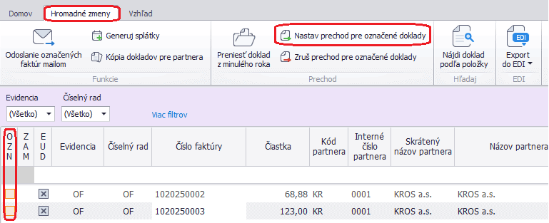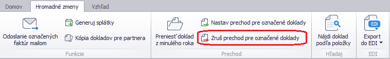 Ak máme takýchto dokladov viac, označíme si ich a voľbu prechodu zapneme hromadne pomocou funkcie Nastav prechod pre označené doklady, ktorá sa nachádza v záložke Hromadné zmeny.