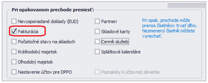 Následne spustíme opakovaný prechod do roku 2026 cez menu Firma – Prechod do ďalšieho roka. V sprievodcovi opakovaným prechodom označíme Fakturáciu a dokončíme prechod.