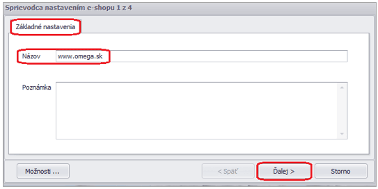 - V prvej záložke Základné nastavenia uvedieme názov e-shopu, ktorý budeme používať. Následne zvolíme tlačidlo Ďalej.