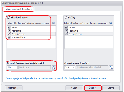 - V druhej záložke Údaje prenášané do e-shopu označíme údaje na skladových kartách alebo službách, ktoré sa budú aktualizovať pri opakovanom prenose do e-shopu. Aktualizovať sa môže názov, poznámka, predajná cena, stav na sklade. Zmenený stav na sklade sa prenáša len pri skladových kartách.