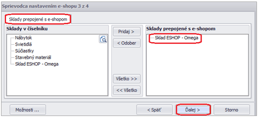 - V záložke Sklady prepojené s e-shopom vyberieme sklady, ktoré chceme s e-shopom prepojiť.