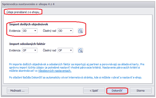 - V záložke Údaje prenášané z e-shopu môžeme nastaviť samostatnú evidenciu pre došlé objednávky a odoslané faktúry.
