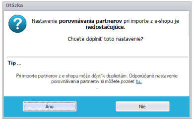 Po stlačení tlačidla Dokončiť sa nás program spýta na porovnávacie kritéria pre import partnerov a skladových kariet. Zobrazí sa nám nasledovná hláška: