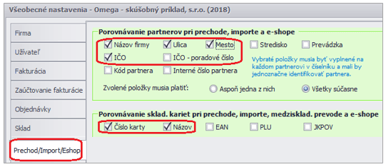 Ak zvolíme tlačidlo Áno, program nás presunie do Všeobecných nastavení programu OMEGA (Firma – Nastavenia – Všeobecné nastavenia – Prechod/Import/Eshop), kde skontrolujeme porovnávacie kritéria.