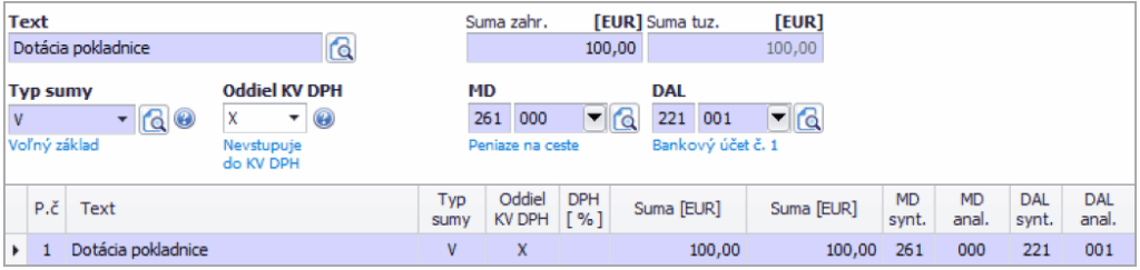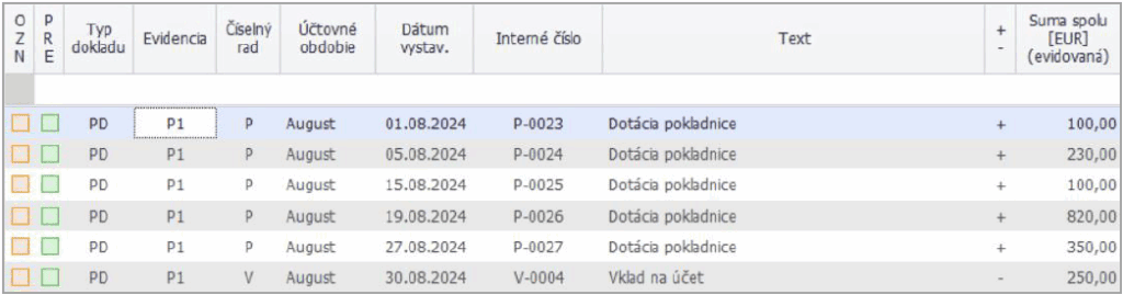Stlačením voľby Ok sa v okruhu PD automaticky vytvoria pokladničné doklady. Tie, ktoré majú v texte Dotácia pokladnice (teda v okruhu BV je účet 261 na strane MD), budú zapísané ako príjmové pokladničné doklady. Doklady s textom Vklad na BÚ (účet 261 bol v BV účtovaný na strane D), sa zobrazia v pokladničných dokladoch ako výdavkové doklady.