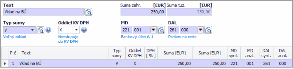 Najskôr si v okruhu bankových výpisov zaevidujeme pohyby o výbere hotovosti do pokladne pomocou automatického účtovania D BV – Dotácia pokladnice a taktiež vklad na účet pomocou automatického účtovania V BV – Vklad na účet.