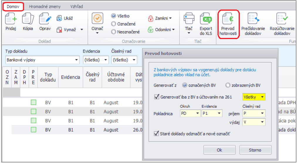 Prevádzate si peniaze medzi účtom a pokladnicou? Zapracovali sme pre vás funkciu Prevod hotovosti, ktorá vytvorí z pohybov v okruhu bankových výpisov automaticky pokladničné doklady.