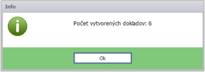 O počte vytvorených dokladov nás informuje aj hláška, ktorú potvrdíme Ok.