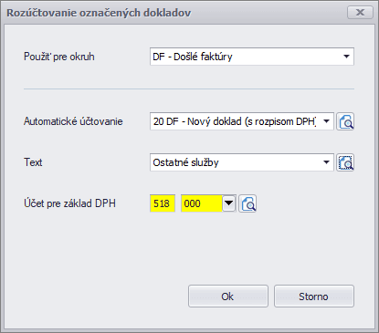 Tiež si môžeme vybrať rôzne typy automatických účtovaní, napr. pre základnú, zníženú sadzbu DPH alebo pre samozdanenie. Pre správne rozúčtovanie dokladu je potrebné, aby bola suma uvedená v rozpise DPH na doklade v správnej sadzbe.