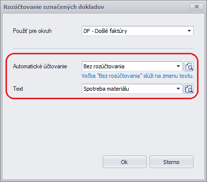 Doklady, ktoré chceme hromadne zaúčtovať, si najskôr označíme oranžovým štvorčekom v stĺpci OZN a následne spustíme funkciu Rozúčtovanie dokladov. Ďalej vyberieme Okruh, ktorý chceme rozúčtovať, Automatické účtovanie, Text a Účet, ktoré sa do dokladu doplnia.