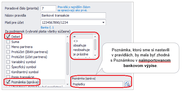 Na obrázku môžeme vidieť, že spoločný znak pre pravidlo bankových transakcií je text Poplatky v poli Poznámka. Pravidlo pre zaúčtovanie položiek v naimportovanom výpise vytvoríme cez menu Evidencia – Importované bankové výpisy – Funkcie – Zobrazené zaúčtuj – Možnosti – Pravidlá pre zaúčtovanie. Zadáme názov a číslo účtu, pre ktoré bude pravidlo platiť. Vyplníme časť Za podmienok, kde si nastavíme, aké kritériá bude položka bankového výpisu spĺňať, aby bola zaúčtovaná.