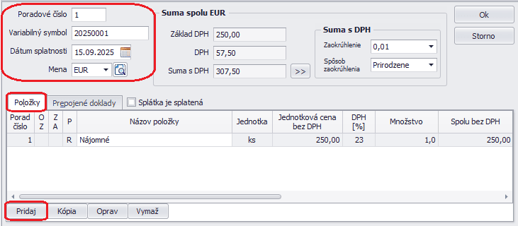 V záložke Položky – Pridaj doplníme jednotlivé položky splátky. Vyplníme Názov položky a Jednotkovú sumu EUR. V záložke EUD si prednastavíme nákladový účet s príslušným analytickým účtom a Typom sumy.